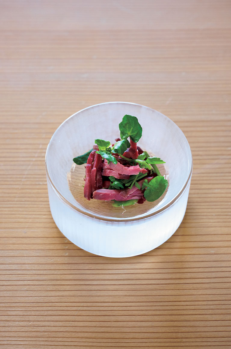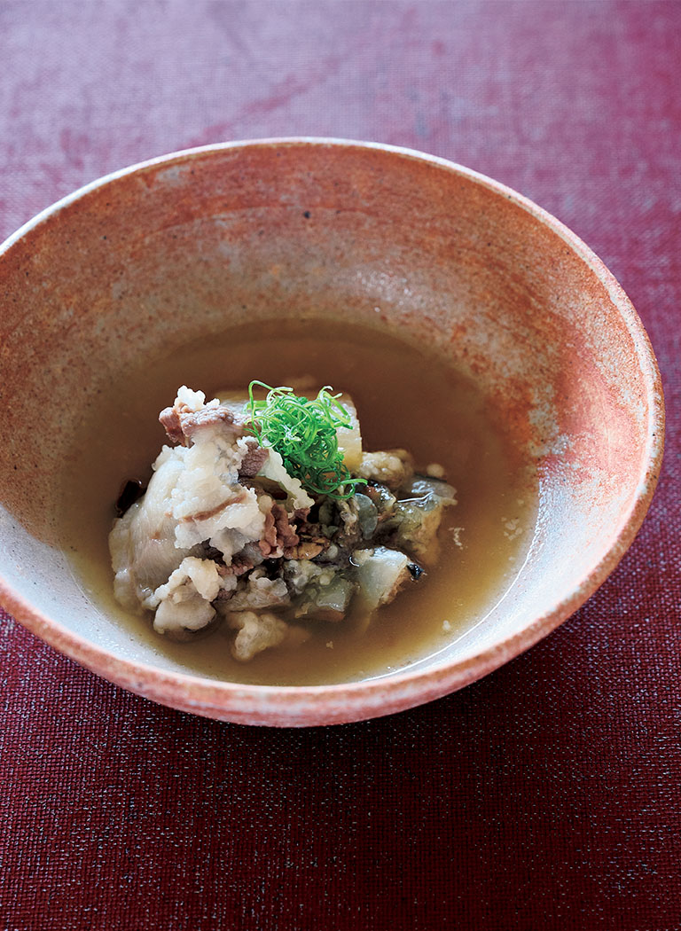 「今月の一皿」に選んだのは、「南魚沼のすっぽんと熊の鍋」だ。すっぽんの骨と熊のブイヨンを約15時間煮込んだ風味豊かな出汁をベースにした鍋は、熊の旨み200パーセント!