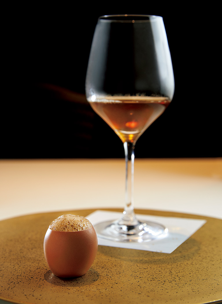 さて、「今月の一皿」は、アミューズの「金谷玉子」を紹介したい。それは、半熟の卵とマッシュルームの泡ソースでできた一品。それに、マッシュルームのコンソメスープが添えられている。たったそれだけの中に隠された多彩な味とキノコの豊かな香りは、心の中に染み込んでくるはずだ。それなのでここはぜひ、お酒を我慢して味わってほしい。