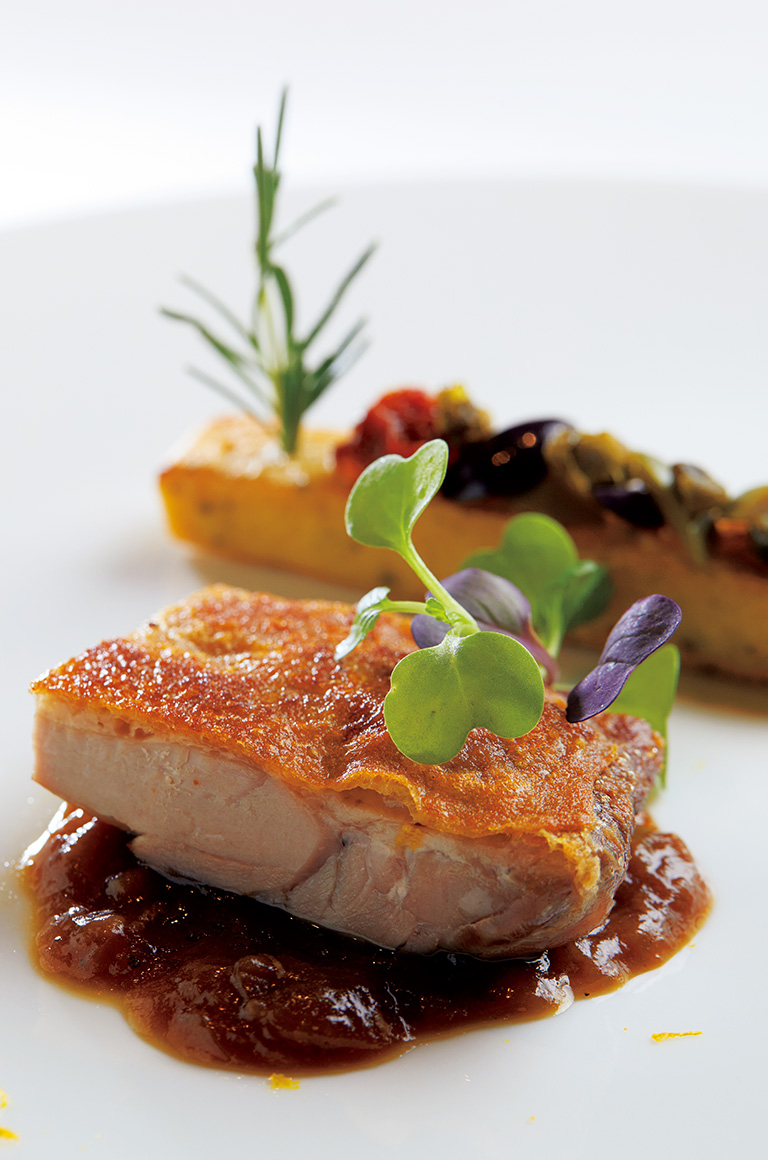森シェフ一押しのメインは、「鴨もも肉のコンフィ」。じっくりとコンフィした肉は、ジューシーで軽快な味わい。身をほろほろと崩して付け合わせと一緒に食べるのもよし、思いっきりかじりつくのもよし、である。