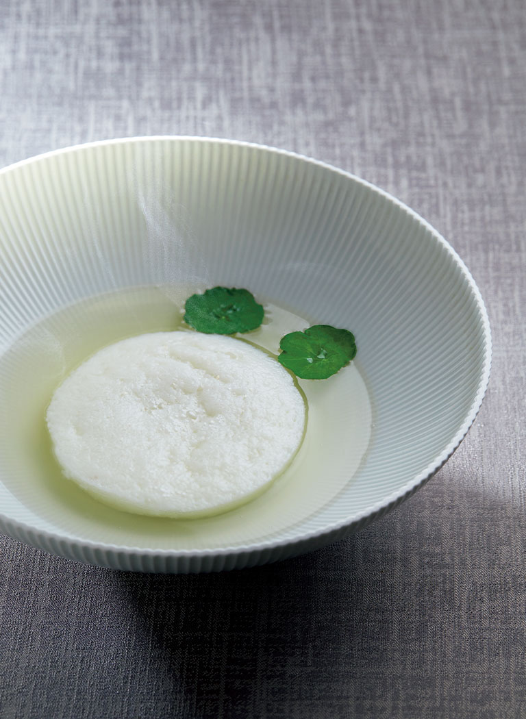 そして、メインとなる「今月の一皿」は、「おぼろ鱧のすましスープ仕立て」。鱧の身、骨、そして皮から取った澄んだスープは繊細な中にも旨みをやさしく感じさせ、一口目から身体の奥に染み入っていく。そこに豆腐のように仕立てられた鱧のすり身が浮かべられ、一皿の中に鱧のすべてが凝縮されている。久々に余韻に浸れる料理に出合った。