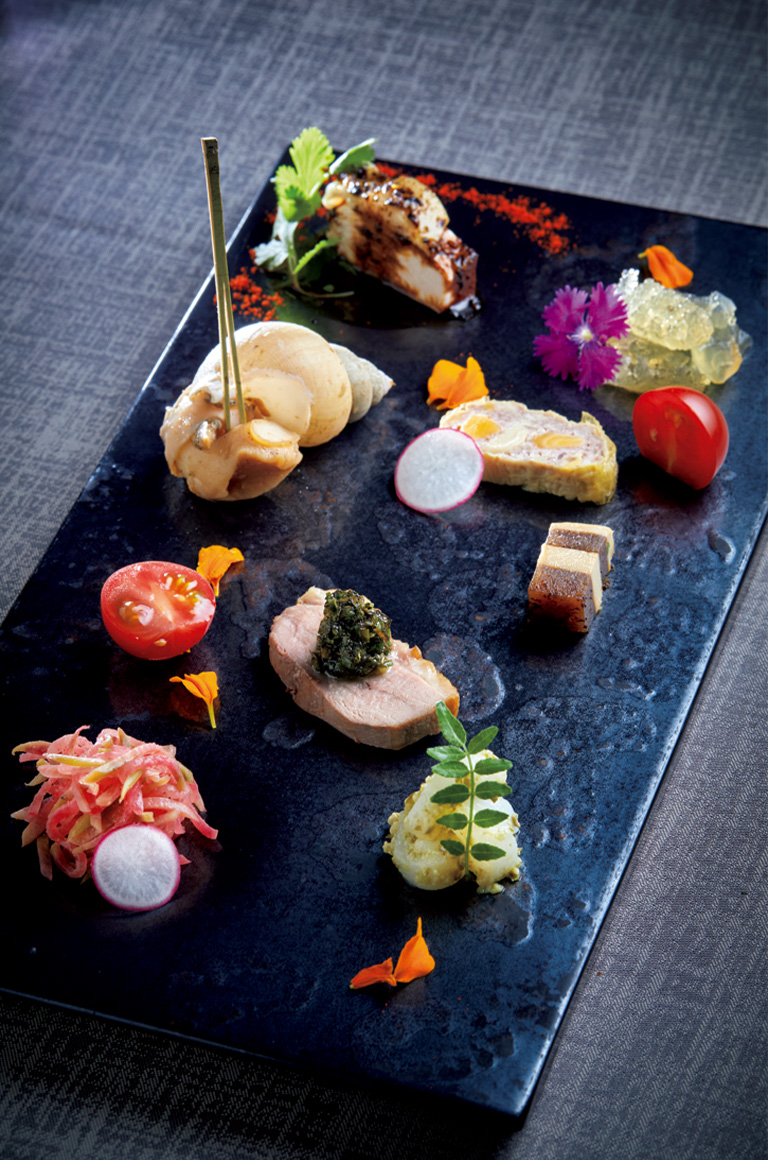 見た目も美しいが、フォアグラとナツメのテリーヌや青豆板醤のイカ和え、バイ貝のオリエンタルソース煮込み、よだれ鶏など、香りとともに甘みや辛味などが田村さんの計算のもと、一皿の中に収められている。