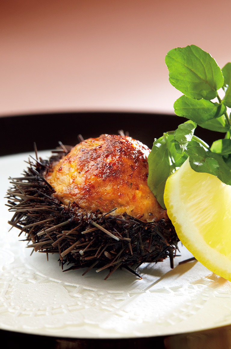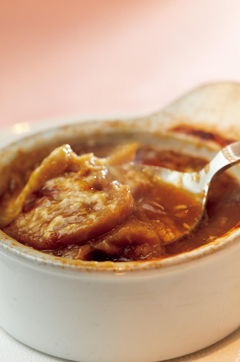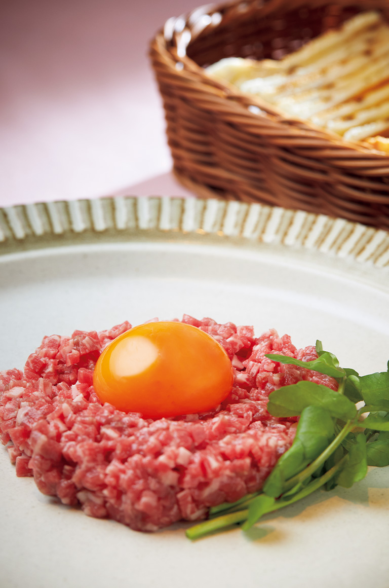 ユニークなのはメニュー。スタミナをつけたい方、噛むのが面倒な方、もうちょっと太りたい方など、見ているだけで楽しくなる。まずは、絶対に頼まなくてはいけない「オニオングラタンスープ」。じっくりと炒めた甘みのある玉ねぎがしっかりと溶け込んで、香ばしい香りが食欲をそそる。2つ目の定番「タルタルステーキ」は、目の前で横田さんが仕上げてくれる。なんと昭和55年に作り方を特許出願した逸品だ。そして、ウニの共殻焼き。ウニとエビのすり身の“共演”は、つまみにぴったりだ。
