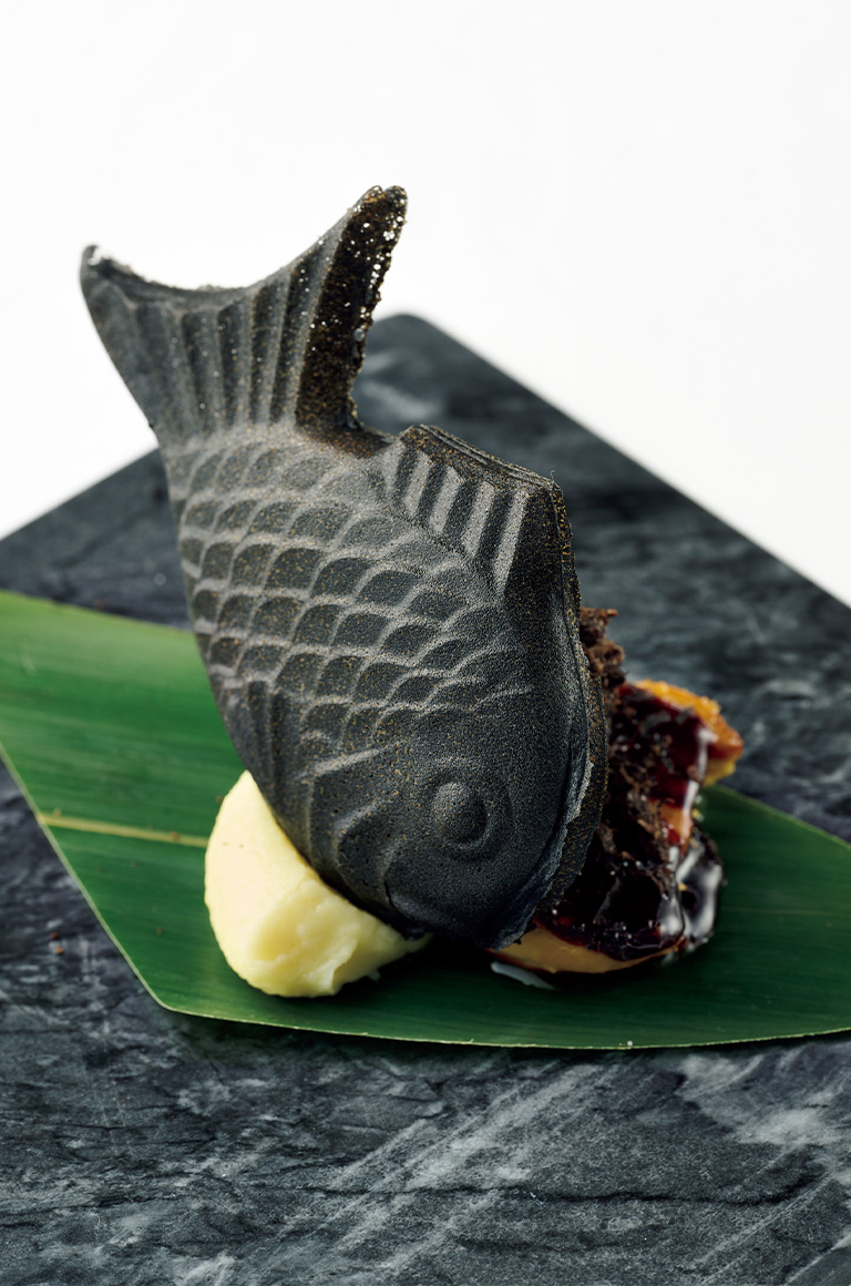 写真の料理はいずれもコースの中の一品。おもしろいのは「さやあかねの黒いフォアグラたいやき」。その正体は実物を見てからのお楽しみで。ランチ7,500円~、ディナー13,000円~。メイン料理を2皿選べるコースは、18,000円。*価格はすべて税込です。