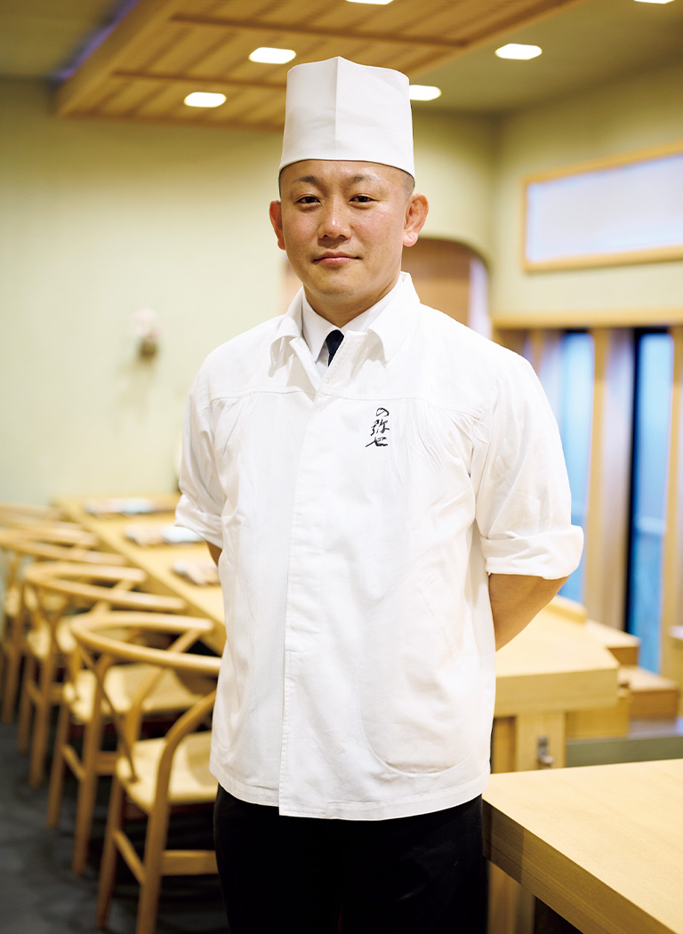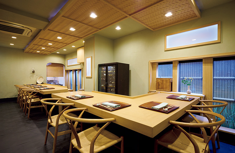 同店は、食い処、飲み処の粋な店が連なる四谷の荒木町でオープンして10年になる。店の扉を開けるとちょっとした空間があり、山本さん自らが探したという大きな灯篭や生け花が目に入って、一旦落ち着ける。銀杏の木でつくられた大きなカウンターがあるダイニングは、とても居心地のいい空間だ。