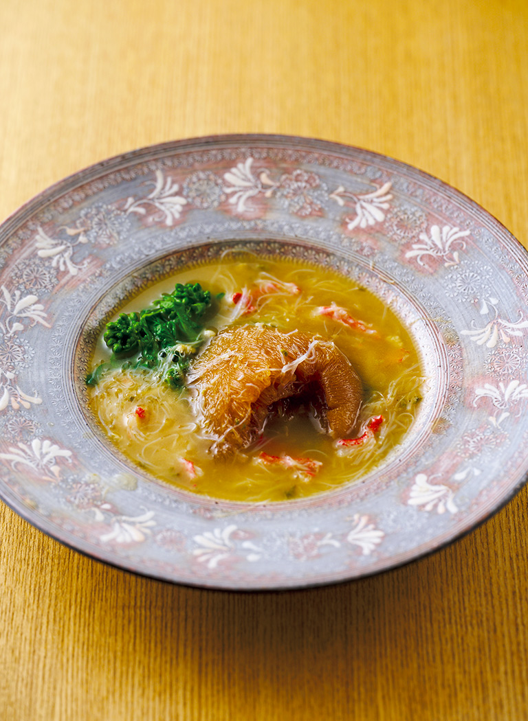 王道の「ふかひれの煮込み」は、シンプルでいて、とても複雑かつ繊細な味だ。それは生臭さを和らげるために昆布で出汁をとり、白湯に清湯を併せてクリアな味を前面に出しているからだ。素材の旨みのみをグッと引き出しているのがわかる。