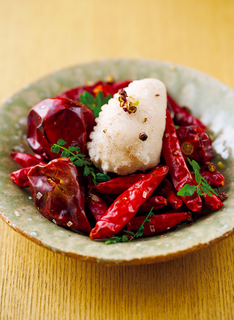 写真3枚目:揚げたフグの白子に、炒めた重慶産の唐辛子と山椒を絡めた一皿。料理はいずれもコースの中の一品。ランチ17,600円~(前日までに要予約)。ディナーは17,600円、25,300円と36,300円の3種類から選べる。*価格はすべて税込です。