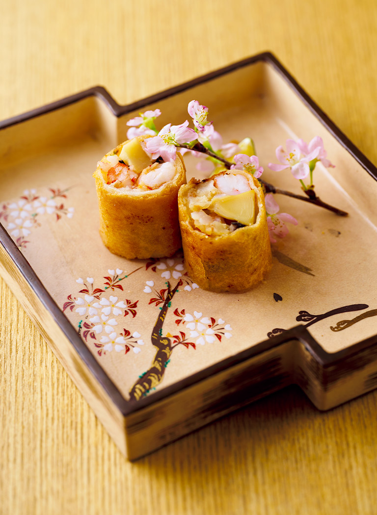素材の良さを引き立てる日本料理と、スパイスや油で奥行きを感じさせる中国料理を融合させる山本さんのお料理。懐石のようにコース仕立てになっているメニューの中から「今月の一皿」に選んだのは「春巻き」だ。諸説あるが、立春の頃に新芽を出す素材を皮で巻いたのが始まりだそうで、こちらの春巻きの中身も、フキ味噌、筍、海老と、まさに春の薫りがする。
