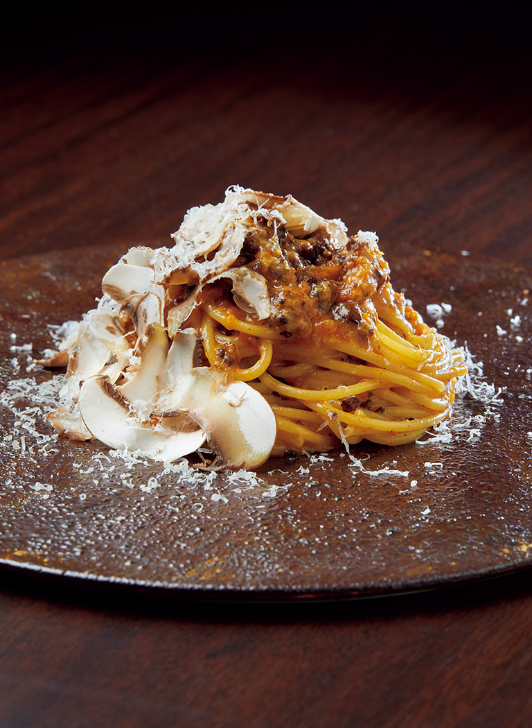 牛と豚を合わせた肉のソースに燻製の卵黄を混ぜこみ、甘みのある味をつくり出している。フレッシュマッシュルームとパルミジャーノレッジャーノが仕上げに削り掛けられた一皿は、パスタなのに目を閉じるとすき焼きが瞼に浮かぶかもしれない。