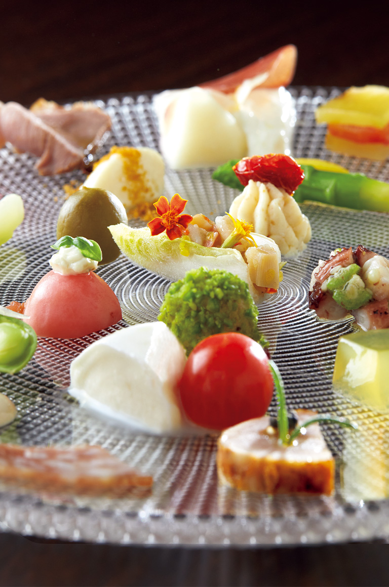 そして、驚きのアペタイザーは、「インサラティッシマ・リナシメント」という30品もの料理が載った前菜の盛り合わせ。全国の生産者から直接手に入れた素材を手間暇かけてアレンジする、まるで宝石箱のような一皿だ。