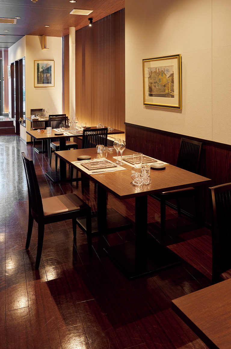 さて、このお店、とにかく目立たない。駅から微妙に離れているし、看板もない。初めて訪れた時は、思わず通り過ぎてしまった。その理由はお客様に目的意識を持って来てほしいからだそうで、レストランに行くわくわく感、帰りの余韻、そういうものすべてを感じるところから演出をしたかったからだそうだ。だから、お店での自由度は高い。プライベートでも接待でも、アラカルトでもコースでも、個室でもカウンターでも、メインフロアでも大丈夫。好きなものを好きなだけ……。最近ありがちなコース一辺倒でないところも、とてもいい。