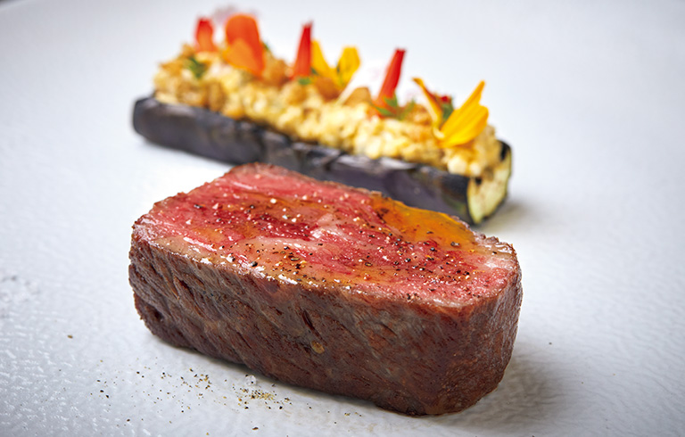 メインディッシュには「『赤崎牧場』赤崎牛ロースト」(4,200円/写真右)がイチオシとのこと。*価格はすべて税抜きです。