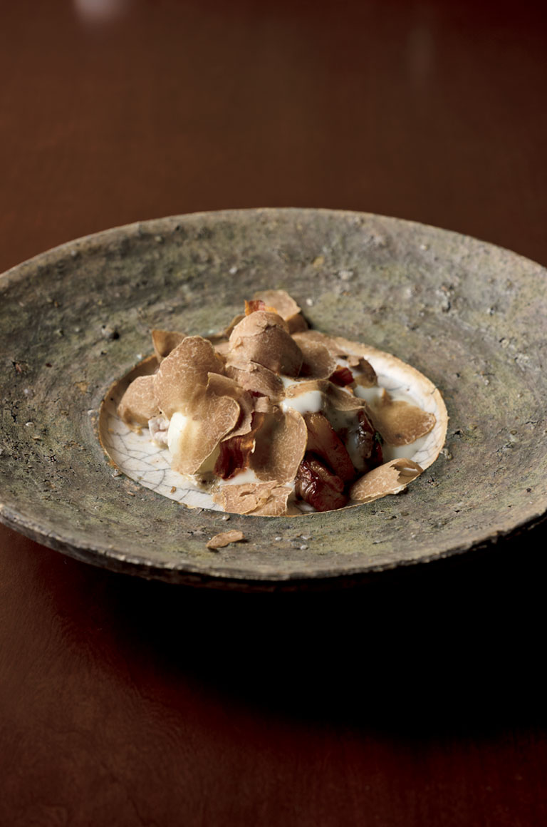 「焼き上げる過程を見ていただきながら、ほかのお料理も楽しんでいただきたい」と井上シェフ。この時期だけのアルバ産白トリュフを削りかけた「オーバーインカミーチャ(服を着た卵)」も絶品だ。店中に白トリュフの香りが舞い、ワインが進む。