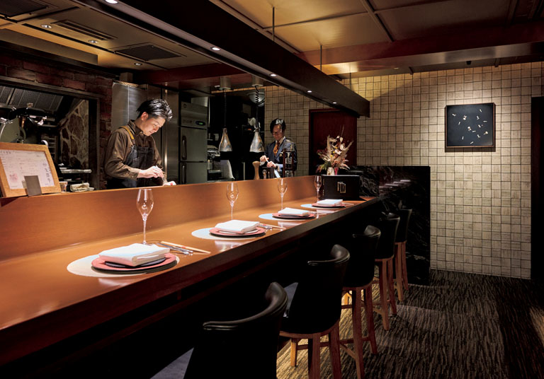 店内に入ると重厚なカウンターがやさしく迎えてくれる。限定6席の特等席だ。奥には落ち着いた個室もあるが、相撲の砂被りのように迫力あるカウンターが僕のお勧めだ。シェフの井上裕二さんとマネージャーでソムリエの山口大樹さんのコンビがおもしろく、時に一緒に参加してくれる雑談が楽しい。