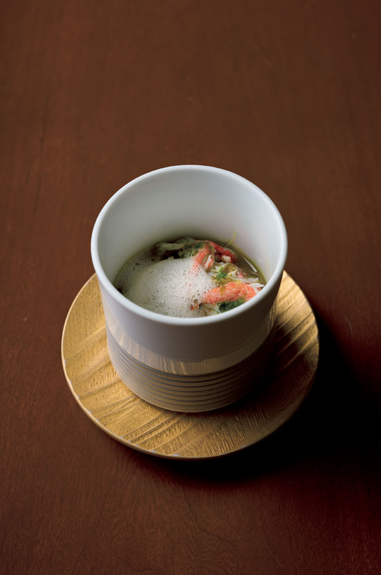 紹介した「シャトーブリアンとイチボ」「オーバーインカミーチャ」、写真の「ズワイガニのフラン」などが提供される、おまかせコースは42,000円~45,000円。アルバ産の白トリュフのコース(3皿75,000円 6皿100,000円)なども好評とのこと。ワインの種類も豊富だが、ワインペアリング28,000円もお勧めだ。要予約のシャトーブリアンのサンドウィッチは22,000円。すべて税込。