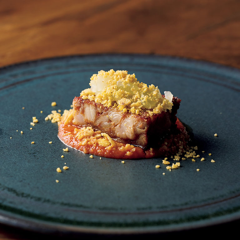 「今月の一皿」に選んだ料理は、「小田原産塩レモンと帆立貝のリゾット」。このリゾットのために特注したという青い皿は、フォークですくうとちょうど7〜8口で食べられる形状にしたそう。レモンの皮によるほろ苦さがほんのり香る。帆立は片面焼きにしているため、クリスピーさを感じさせながらも、しっとり感がある。