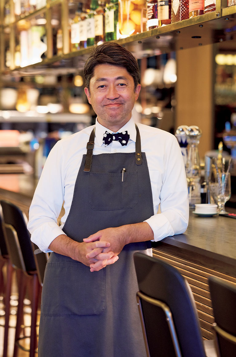 入口でまず目に飛び込んでくるのは、スタンディングバー。ダイニングテーブルにつく前に、ここで食前酒を楽しめる趣向だ。同店のエグゼクティブシェフの入江誠さん自らがゲストをここでもてなすこともあるという。