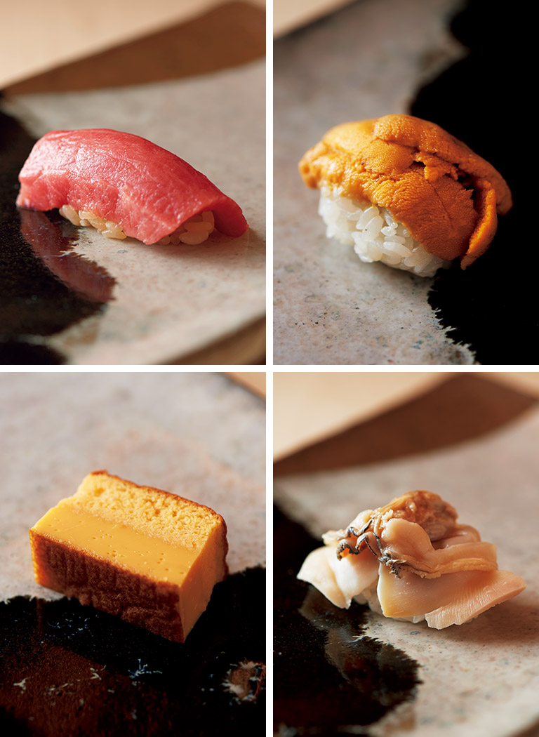 卵焼きは、カステラか、はたまたチーズケーキかと見違えるほど、完成度が高い。芝エビや山芋が入った卵液にメレンゲを加えることで、くっきりと二層の卵焼きを作り出している。クライマックスはこの店の鮨を監修する「やま幸」代表・山口幸隆氏が選び抜いた最上級のマグロの握り。口に運べば、恍惚の時が訪れる。