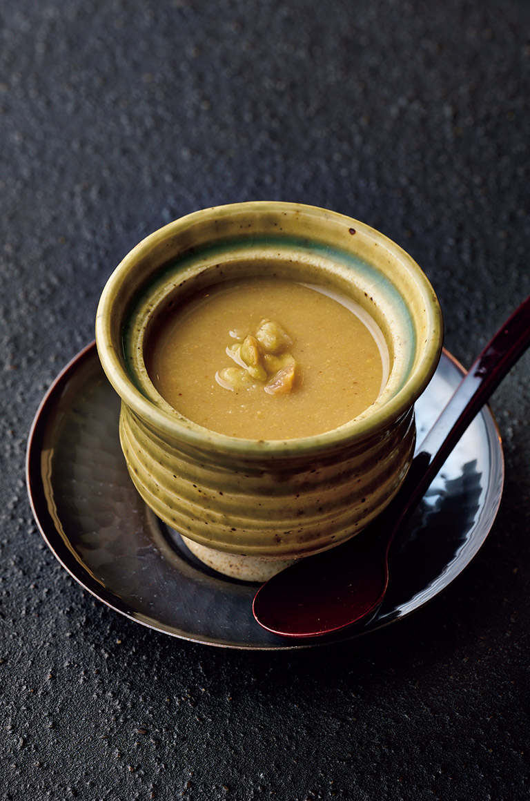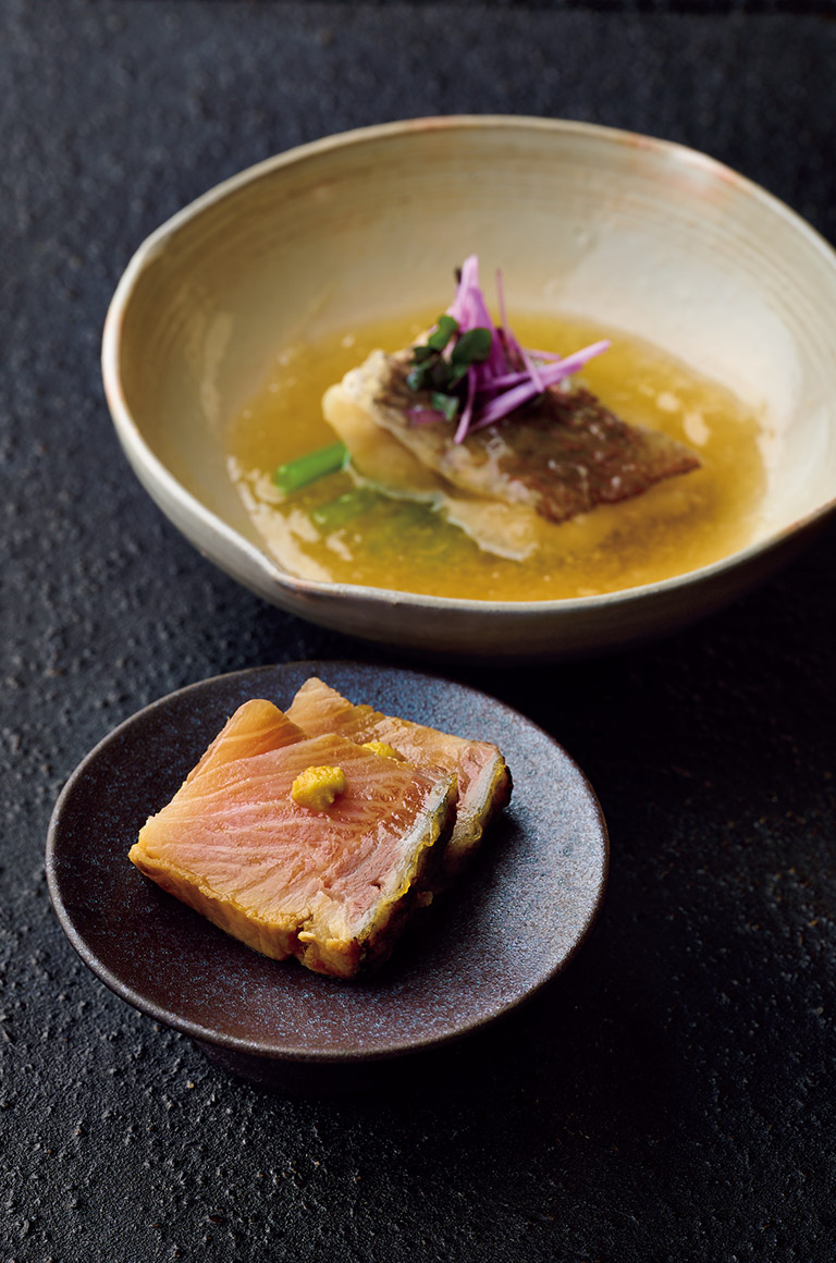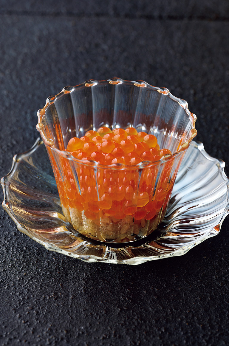 そして、なんとも美しいイクラご飯は秋限定のメニュー。大粒で皮が薄いものを選んでいるそうだ。ご飯がイクラでほぼ見えない贅沢な一皿は、酒呑みにはたまらない。栗の餡をかけた茶碗蒸しや丸一日出汁とともにヅケにしたブリなど、一つひとつに手がかけられていて大切に食べたくなる。