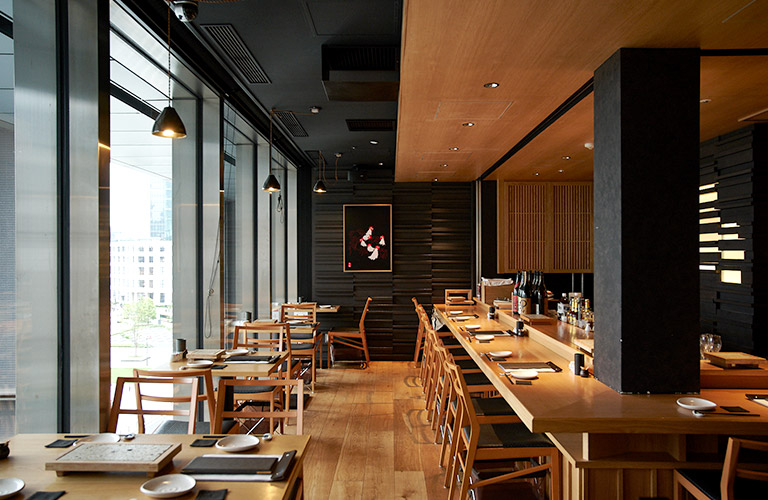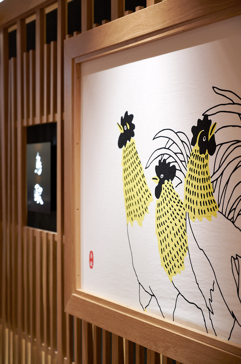 新丸ビルの5階には、おでんの名店や新しいイタリアンなど、グルメな店が並ぶ。どこに入ろうかと迷うが、その並びにひときわ目立つ鳥の絵が掲げられた店がある。そこが『鳥歐』の入口だ。店に入ると、焼き場を囲むようにカウンター、東京駅が見える大きな窓側にテーブルが並ぶ。いくらカウンター好きの僕でも、ここではやはり窓際が特等席だ。
