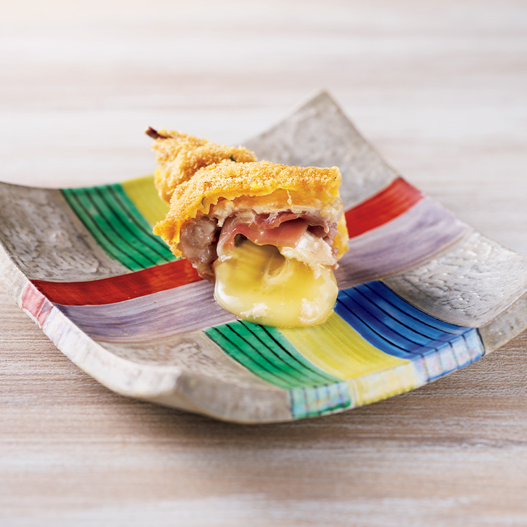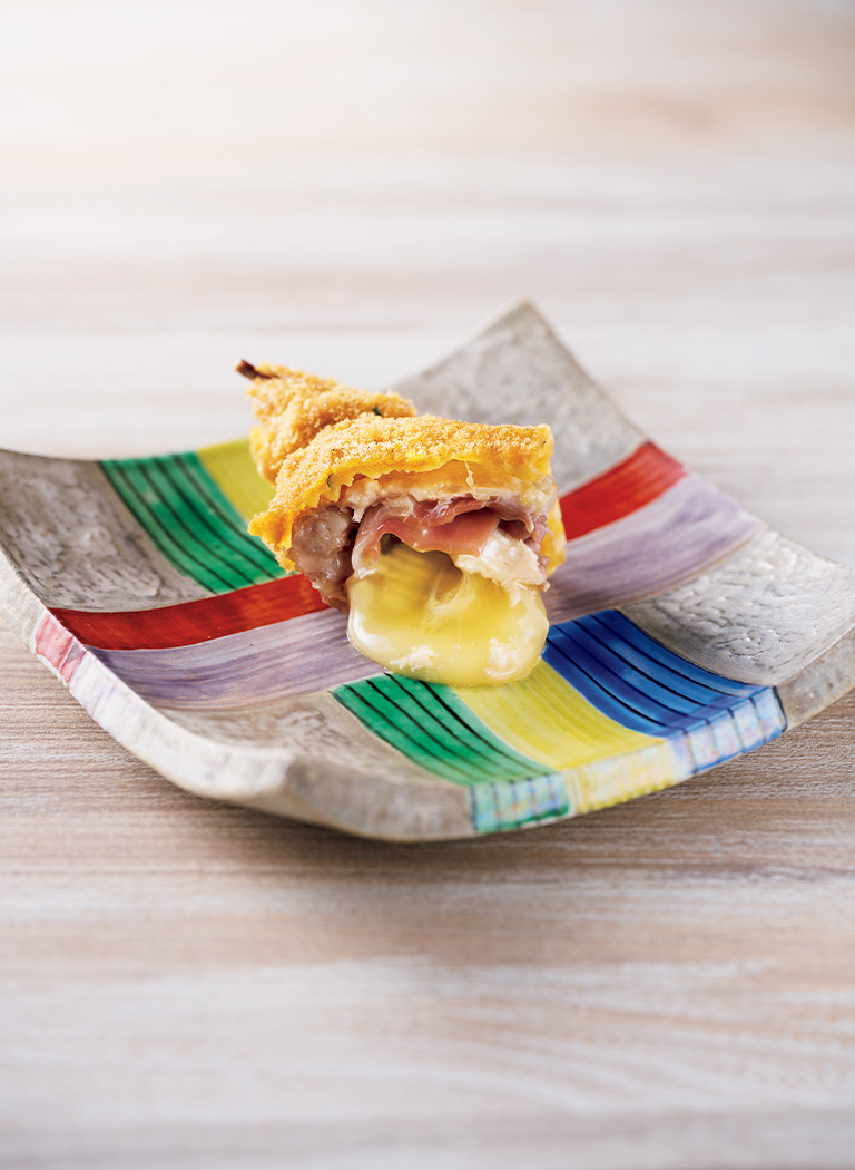 「今月の一皿」に選んだのは「ウズラのコルドンブルー」。コルドンブルーとはフレンチの伝統的な調理法だが、金川さんは仔牛の代わりにウズラを使う。ウズラのいいところは淡白で主張しない味。だからそこにカマンベールと生ハムを合わせ、バランスを取る。それにつける衣は企業秘密だそう。