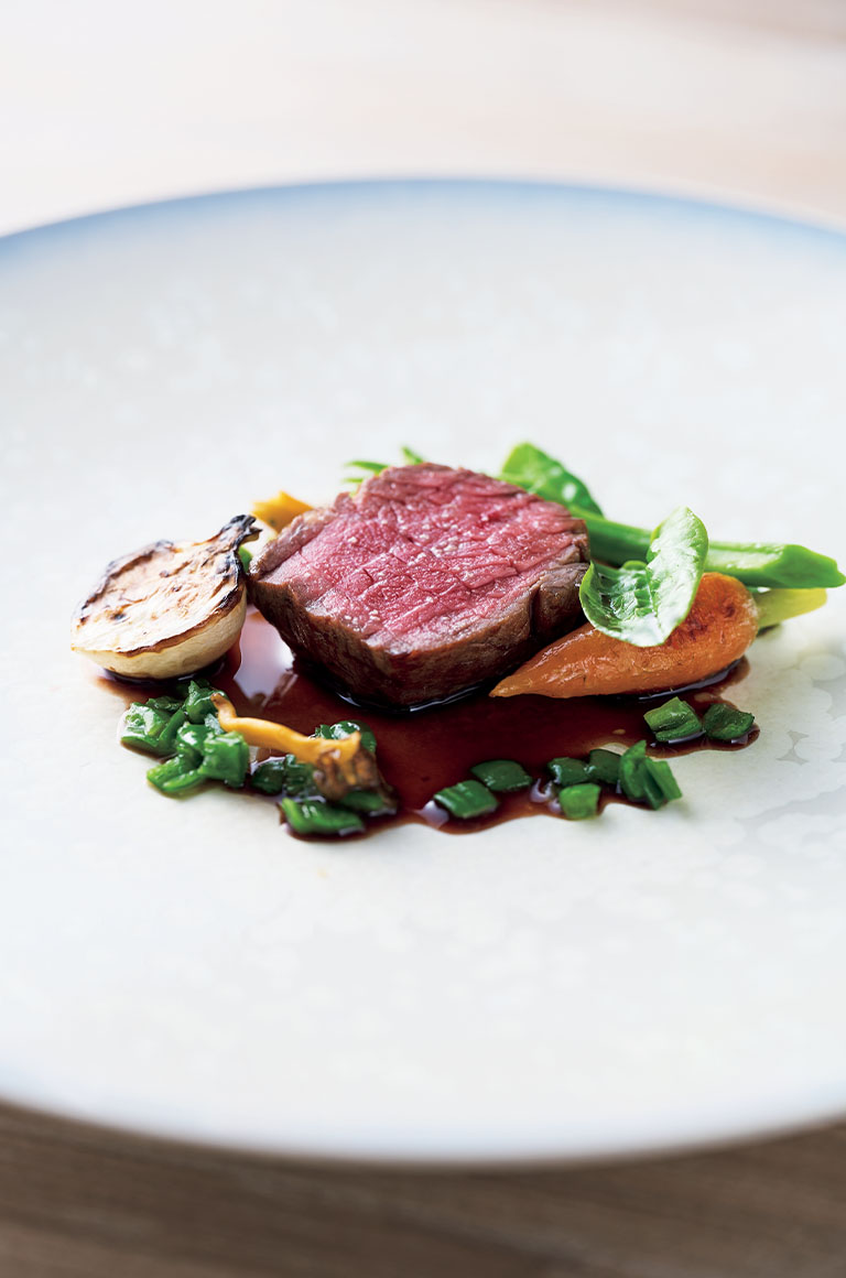 メインは「菊池源吾牛」という熊本県菊池市で育てられる珍しいブランド牛のロースト。熊本出身のシェフだけあって、故郷の食材推しなのだ。
