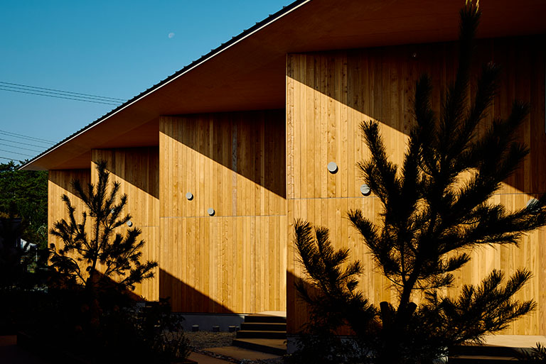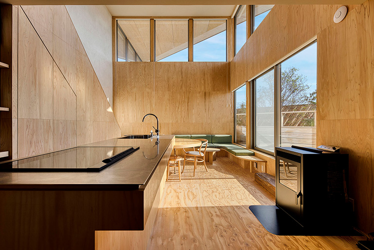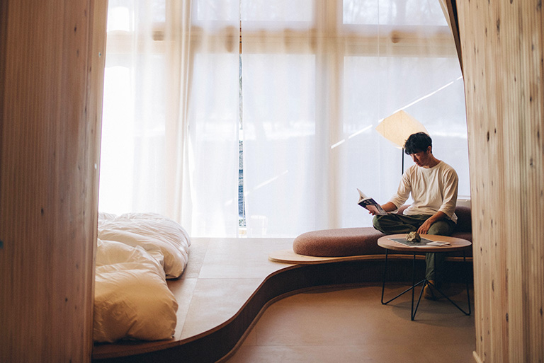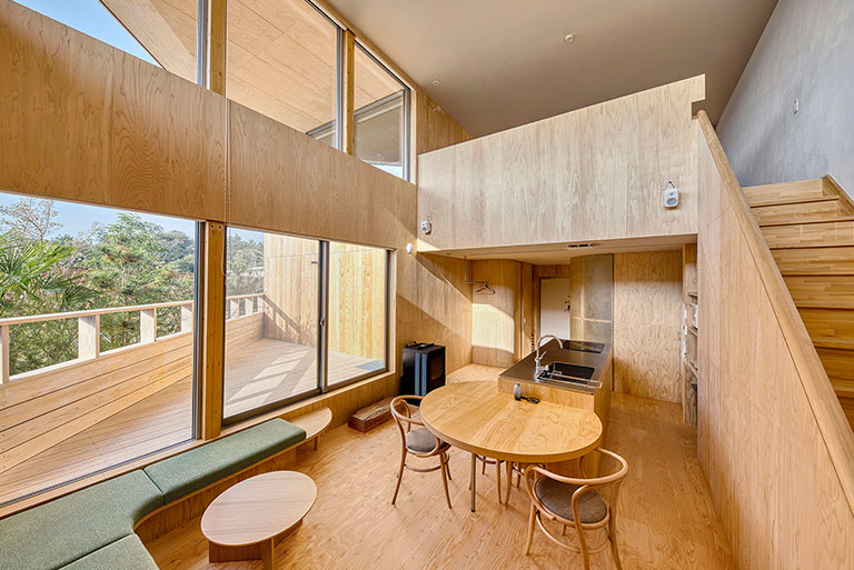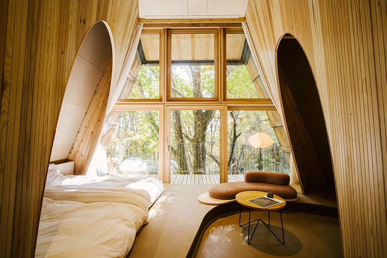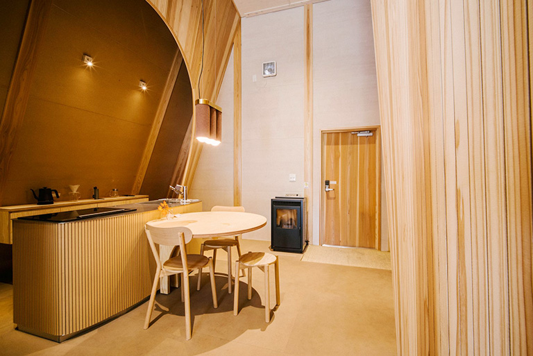 朝から外を見ているだけで、朝露のきらめき、木漏れ日、燃えるような夕陽、満天の星空など、時間の移ろいを堪能できる。都会に比べ自然との距離がグッと近くなっていることを体感する。また、室内は国産木材の香りに満ちているという。室内構造は家具も含めて、直線をなるべく使わないようにしている。それは、自然界に直線というものが存在しないからだ。室内からすでに、自然とのグラデーションが始まっている。