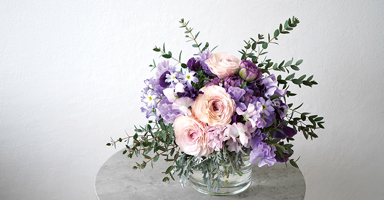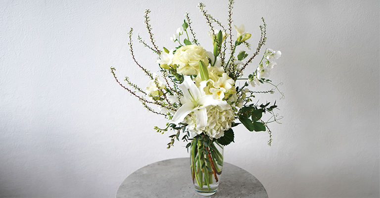 熟練のデザイナーにより緻密に組み上げる花束。プレミアムプラン(東京23区限定)は、花瓶に水が入った状態で届けられる。