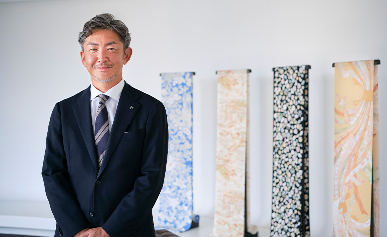 新卒での入社後、営業部、企画部などで経験を積んだ後、千總のものづくりを担う製作部の本部長を長年務め、毎年数々発表されるきものの企画から職人体制の構築までを統括。また千總グループのクリエイティブ事業を展開する子会社の代表としても活躍し、京友禅のデザインや技術力を背景にしたファッションテキスタイルのプロデュースや海外ブランドとのコラボレーションなども積極的に展開。2024年より株式会社千總ホールディングス代表取締役専務および株式会社千總代表取締役社長に就任。