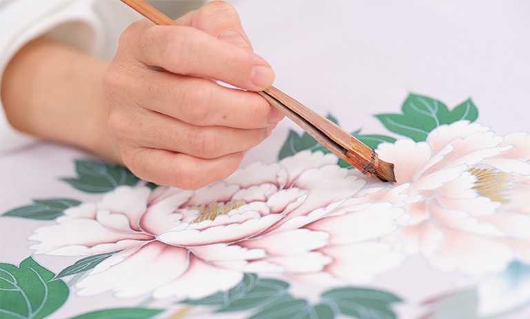一色ずつ手作業で色を染める「色挿し」の工程。作業は一工程一職人の分業体制で行われる。