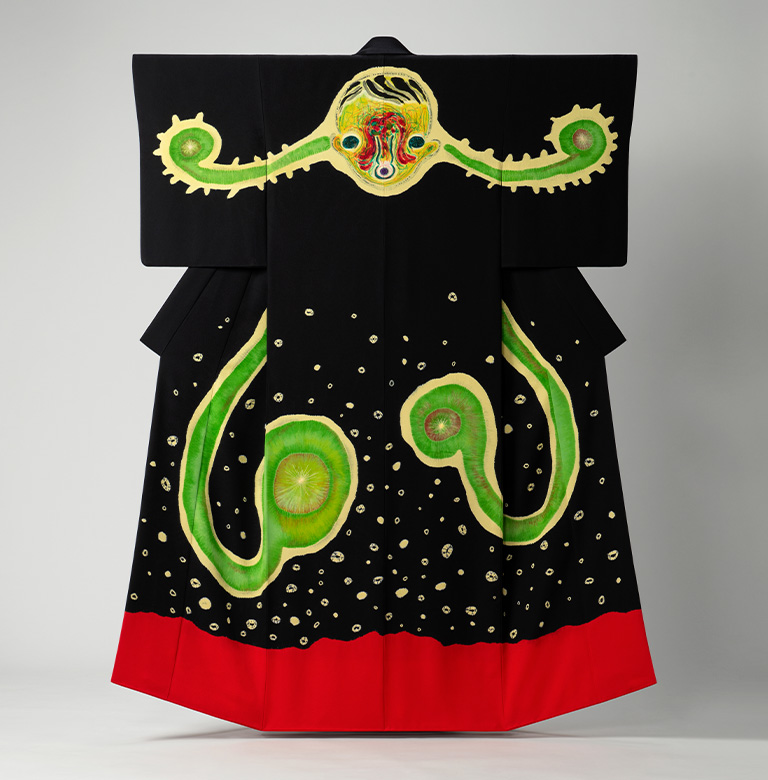 加藤氏の描くプリミティブで力強い生命力に満ちたモチーフが、千總が誇る友禅染の繊細で奥深い技法と融合し、アートピースを纏うかのような新しい視点を着物の世界にもたらした。
