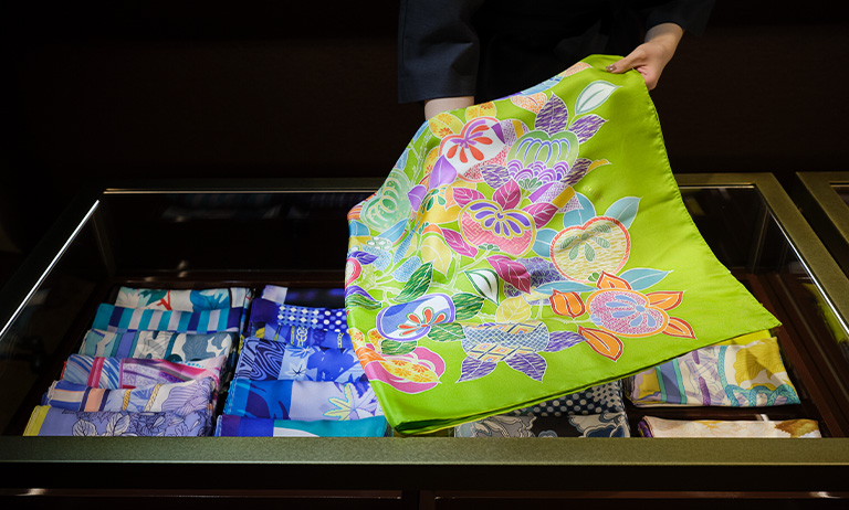 手描き友禅のスカーフは、職人の手仕事が現代に昇華された逸品。
