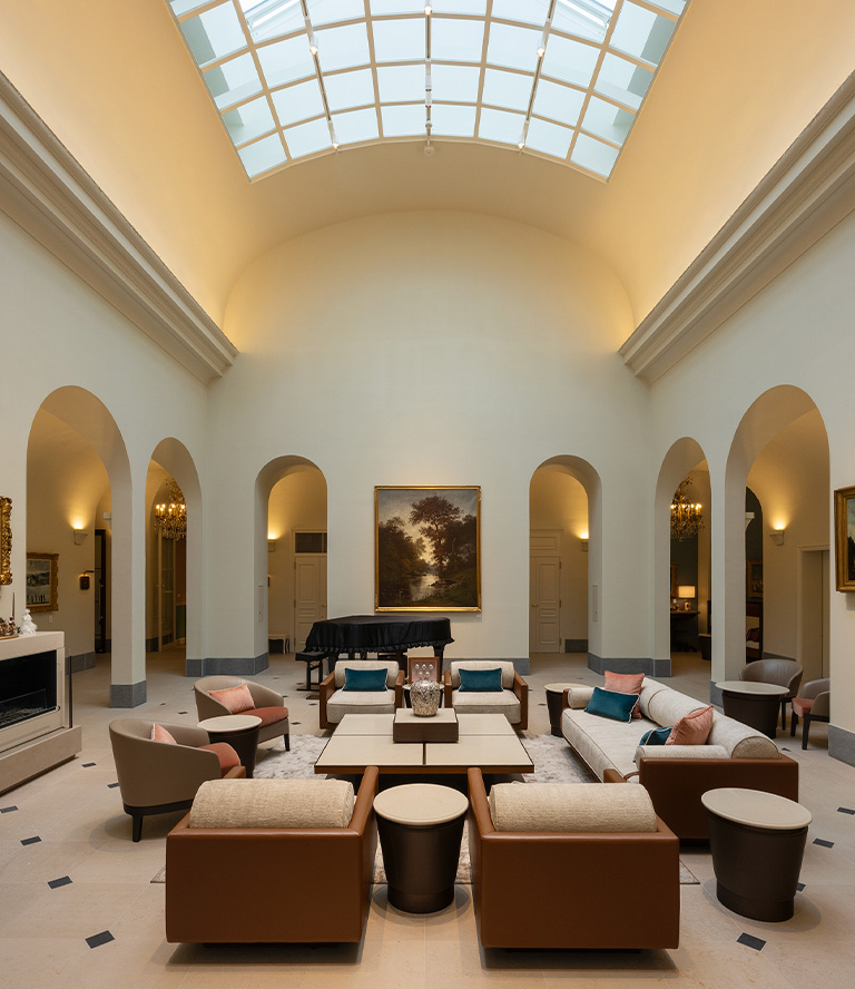 エントランス奥に広がるウィンターガーデン。扁平アーチ状の天窓からやさしい光が降り注ぐ。ソファはフランスのブランド「Duvivier Canapes」のオーダーメイド製。