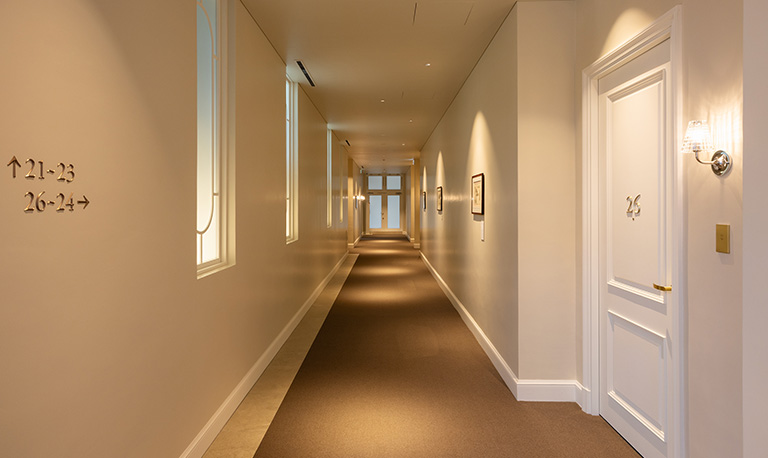 アーチを描く回廊や螺旋階段も、『ホテル ドゥ ラルパージュ』を象徴する意匠のひとつ。図面上の曲線を実現するため、現場では高度な技術を持つ職人たちが、細かな調整を重ねてきた。ここにある美しさは偶然の産物ではなく、明確な意志と手間の積み重ねによってかたち作られている。
