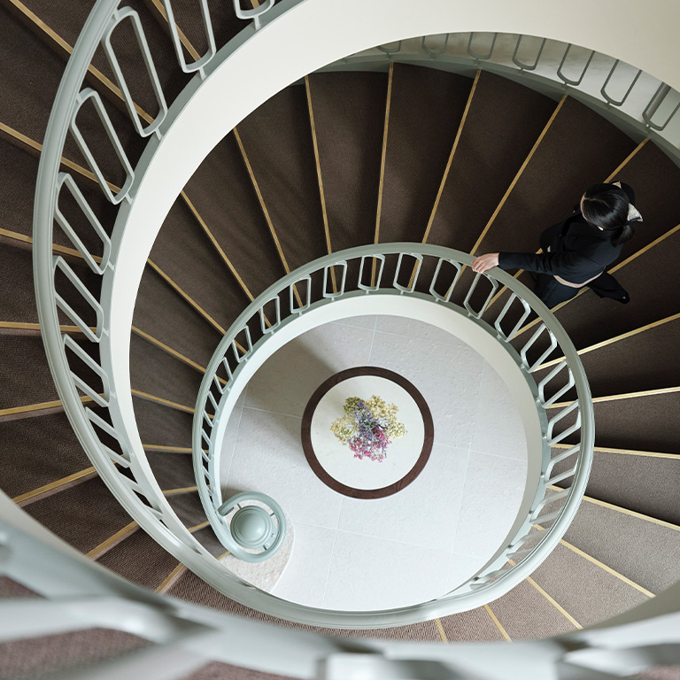 螺旋階段は、鉄骨で薄く軽やかに造られている。構成するなめらかなカーブには、職人の技術が詰まっている。