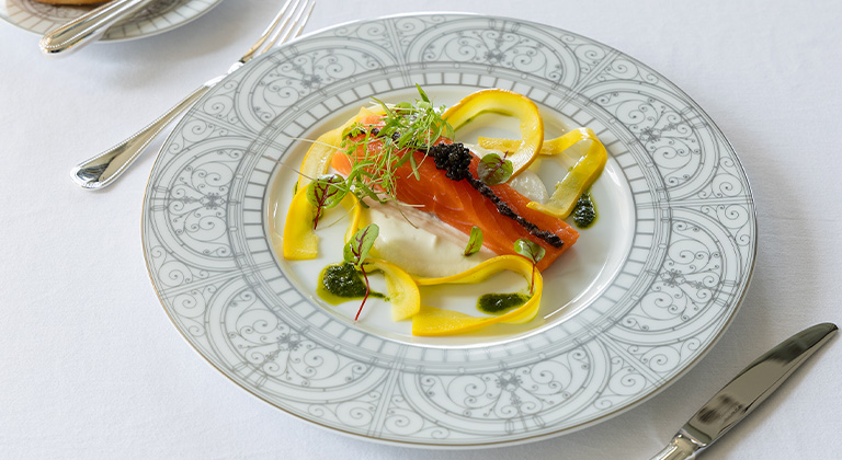 春のメニューの前菜として提供される「信州サーモンのミ・キュイ」。下に添えられているのは春先に甘みを増すカリフラワーのムース。