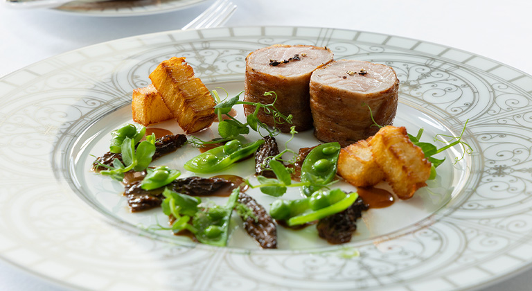 春のメニューメイン料理のひとつ「仔牛のロースト」。63度の低温で1時間火入れがされ、自家製のパンチェッタが巻かれている。