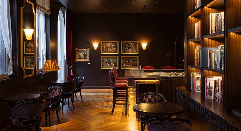 落ち着いた配色のバースペース。テーブルセットの椅子には、パリ・オペラ座の観客席と同デザインのものをフランスから取り寄せた。