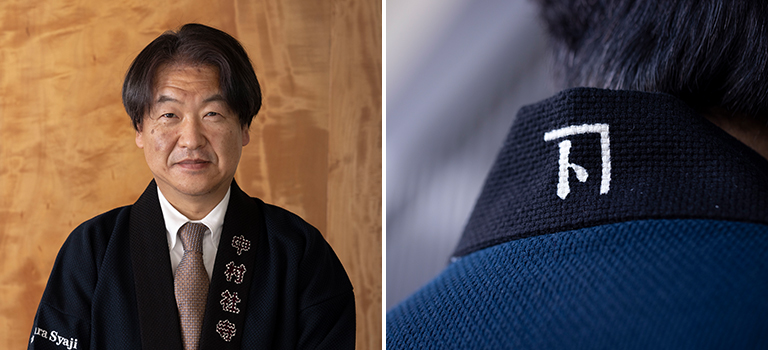 中村社寺伝来の印半纏をまとった加藤氏。襟には屋号の「カネト」が染め抜かれている。