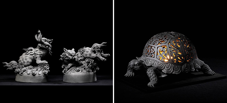 令和元年(2019年)創業の『鬼賢瓦』(岐阜県)の美濃瓦鬼師(鬼瓦の職人)が手がけた瓦のオブジェ。中国から伝わった想像上の幻獣「貘(ばく)」。/亀の瓦灯「タートルランプ」。(写真提供・中村社寺)
