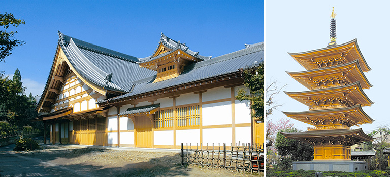中村社寺が手がけた施工例。岐阜県多治見市の臨済宗永保寺の庫裡。/東京都世田谷区尾山台の浄土宗寺院・傳乗寺、東京では珍しい木造の五重塔。(写真提供・中村社寺)