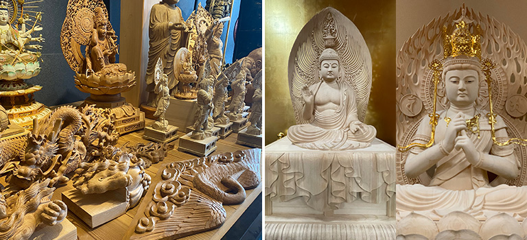 大正3年(1914年)創業、社寺仏閣彫刻『らんまの大橋』の4代目が手がける精緻な木造彫刻。右は阿弥陀如来坐像と大日如来坐像。(写真提供・中村社寺)