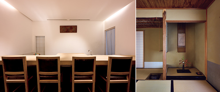 見事な檜の一枚板がカウンターとして使用されている。設えの一つひとつに美しさの宿る店内。右:茶室は、名目どおりに使用されることもあれば、設えを変え、季節の茶懐石を振る舞う舞台にもなる。都心であることを忘れさせるような静謐な空間。