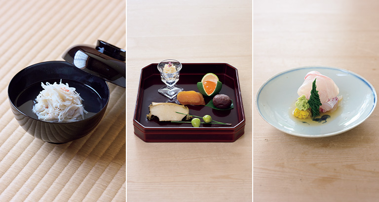 魯山人の椿鉢、渡辺喜三郎の真塗煮物椀、まるで物語を見るように運ばれてくる美しい料理たち。器は古今東西、観自在。「お客様は美味しいものを召し上がりにいらしてくださるわけですから、丁寧に手間を厭わず料理を供します。こだわりというのは時に不自由を生み出すこともありますが、それを精進して繋いでいくことが大切なのではないかと思います」