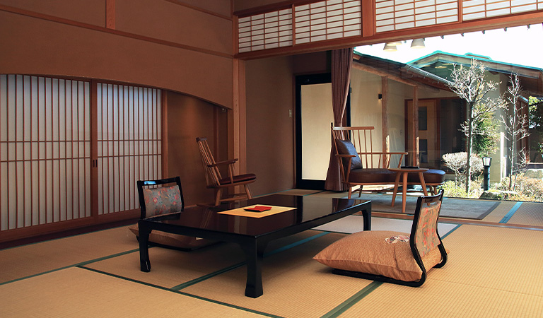 「庵梅(いおりのうめ)」と名づけられた107号室。部屋の名はすべて狂言の演目からとられている。