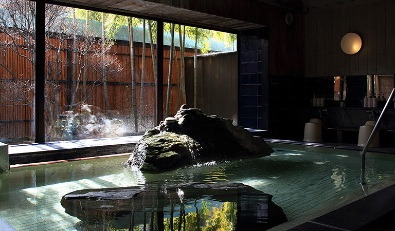 地元の天然石をふんだんに使った内風呂と露天風呂は温もりと癒しを与えてくれる。