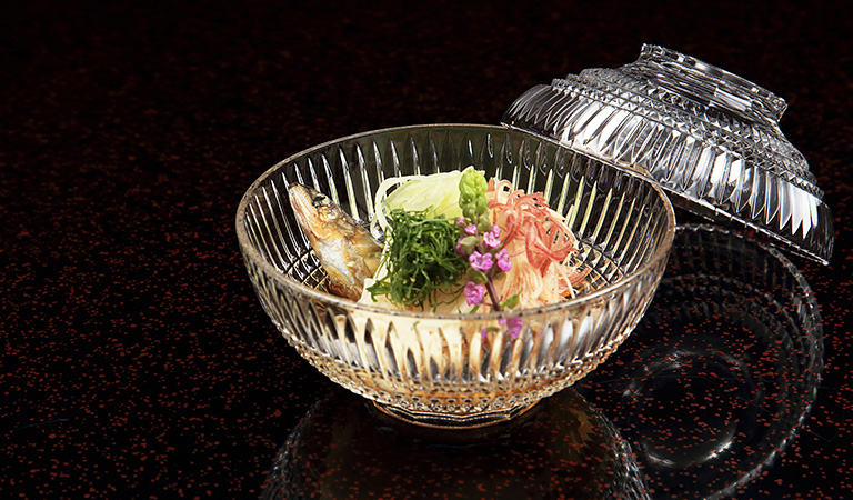 「地物の食材を大切に、目でも楽しめる料理を」。今春から新料理長となった大川匠料理長は語る。信州懐石の一例「冷やし稚鮎素麺」。