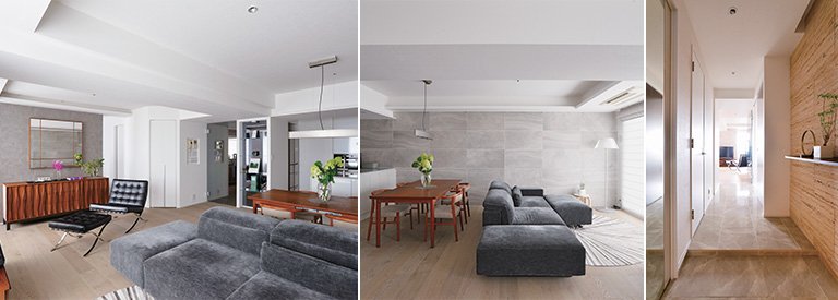左:「広いLDKを」というご要望に応え、リビング・ダイニングと洋室の間の壁を取り一体化することで、開放的な空間を実現。中:フルオープンにしたキッチンからは、リビング越しに窓の外の景色を眺めることができる。右:側面石貼りの素材感のある玄関。左側のミラーを開けると大容量のシューズインクロークが広がる。