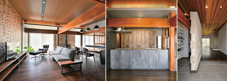 左:薪ストーブと欅の差し鴨居が目を引くウッディなリビング。床はオークのなぐり調、壁にはウォルナットのウッドタイルや大谷石を採用。中:石を思わせる無機質なデザインのキッチン。調理家電などはすべて壁面収納に。右:開放的な玄関ホール。シューズクロークは大谷石の壁で仕切り、天井はウォルナット仕上げ。