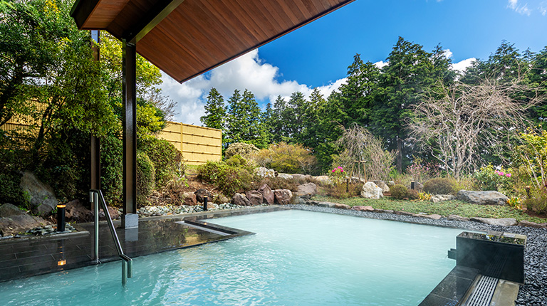 乳白色の温泉は特に女性客に好評で「美肌の湯」としても知られている。宿泊中は、到着後すぐに露天風呂で心身をほぐし、中庭の散策でクールダウン、ラウンジでのひとときを過ごしてもらうことを提案している。「お休み前に星空の下で再び湯を楽しんでいただき、早朝には澄んだ空気の中での湯浴みをご体感いただけます」との笹尾支配人の言葉のように、時間ごとに異なる風情を楽しみたい。