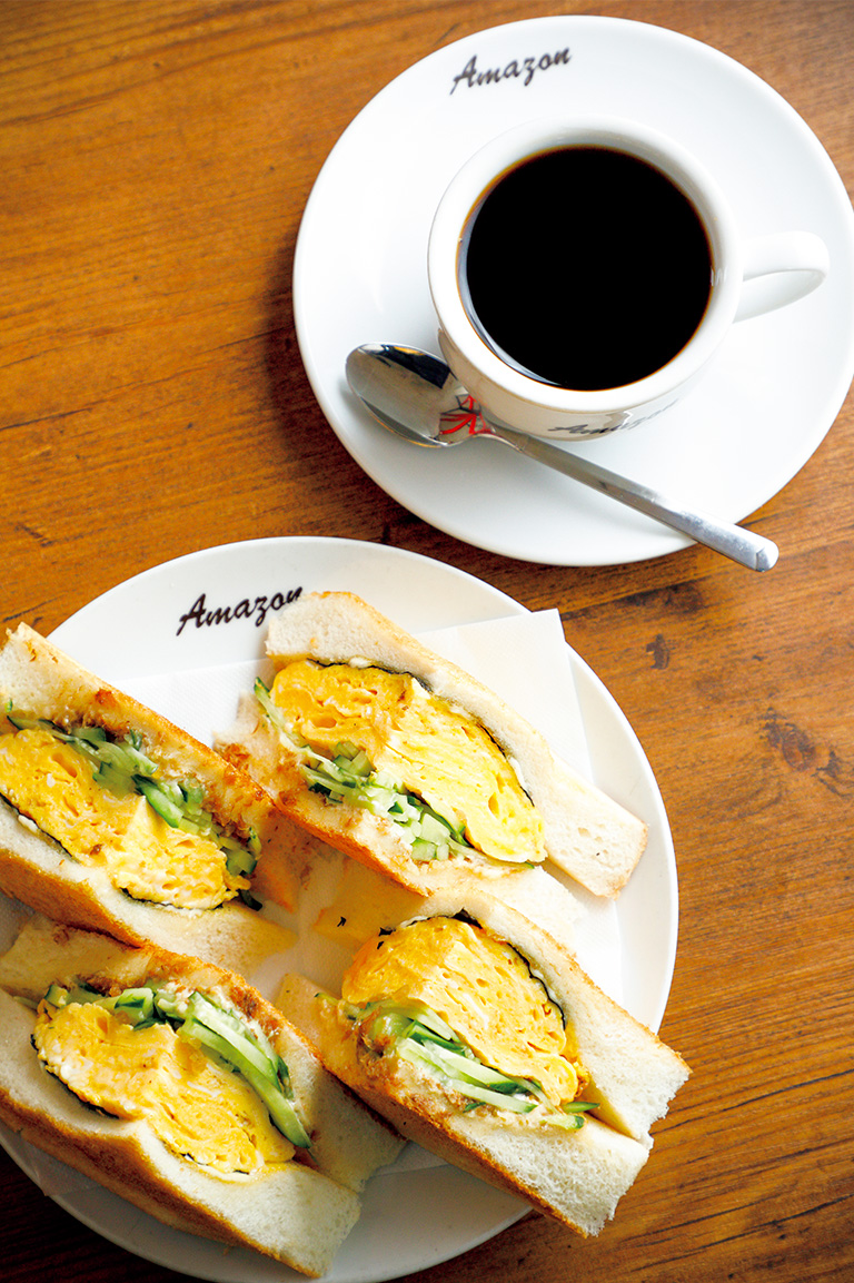 香ばしくトーストされた食パンの間に、ぷるんと厚い卵焼きと細切りのキュウリ、そして海苔と削り節が挟まれたサンドイッチ。かぶりつけば、ほのかに白だしの香る温かい卵焼きとシャキシャキのキュウリの絶妙な対比、そして口一杯に広がる海苔と鰹節の風味に、なるほど和風と膝を打ちたくなる。はじめガツンと濃く苦く、後を引かないさっぱりとしたコーヒーも目を覚ましてくれる。